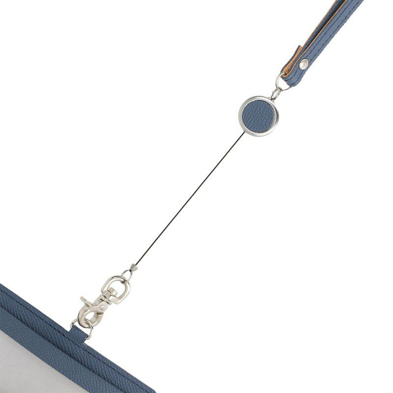 カラーは、2025年春の新色として登場した、フォグブルー。シーンを選ばずに使える、上品なニュアンスカラーに仕上げました。表の窓付きカードポケットは、ゆとりを持たせた大きめのサイズ。裏側にもポケットがあり、予備の名刺を3~4枚程度入れられます。同色のネックストラップは、最大40cmまで伸びるリール付き。首にかけたまま伸縮するため、社員証を読み取り機器にタッチしやすくなっています。一定の負荷がかかるとプラスチック部分が外れるセーフティーパーツも付いています。上質な国産カウレザーは、しっかりとしたハリがあるのが特長。傷にも強く、使い込むほど型押しされた斑がなめらかな風合いになります。発色の良い色合いと、型押しレザーの表情が上品な印象のアイテムです。