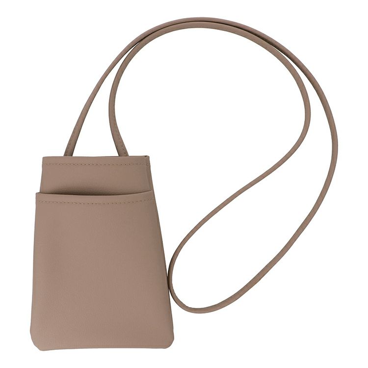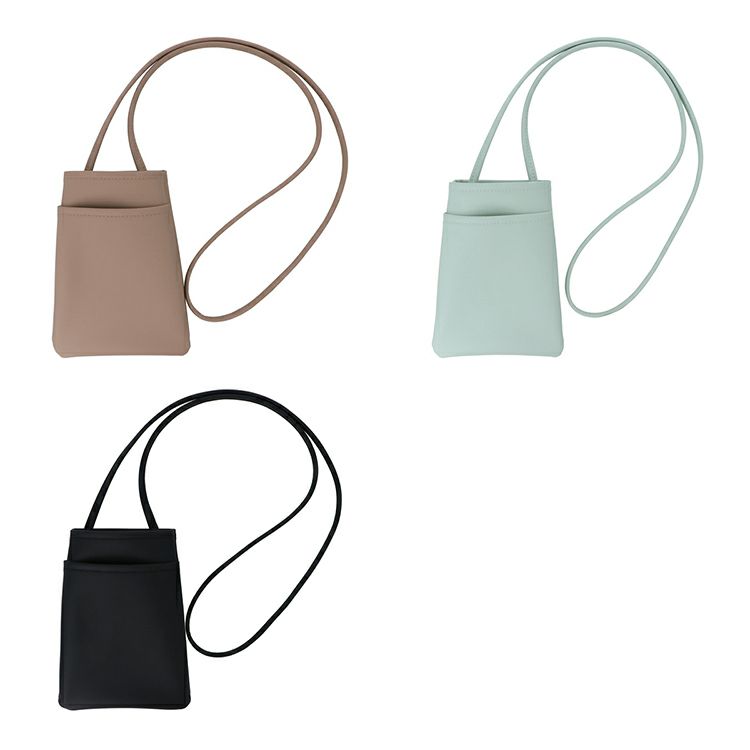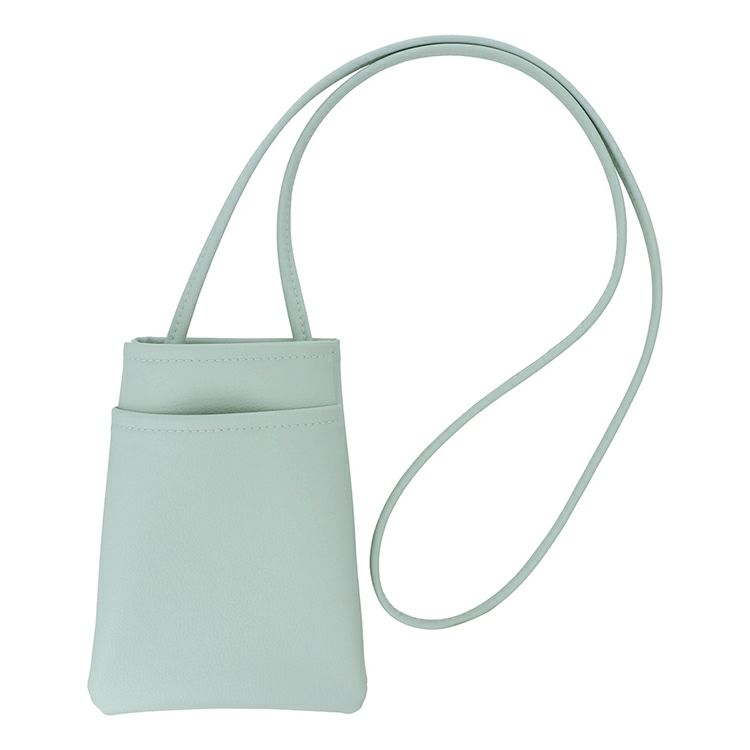 カラーバリエーションは、新色の柔らかな色味のキャラメル、ミント、ベーシックなブラックの全3色。やわらかな合皮を使用した上品なサコッシュ。内寸は、横10cm、縦16cm程度です。折りたたんでもしわになりにくい素材で、日常生活での使用のほか、メインのバッグに忍ばせて、旅行先での使用もおすすめ。スマートフォンやミニウォレットが入る、コンパクトなサイズ。