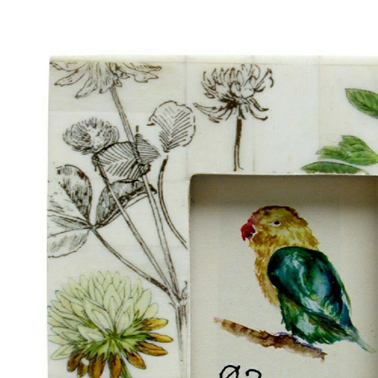 ボディにはバッファロー(水牛)骨を使用。インドの民芸品として伝わる動物の骨のフォトフレームは、天寿を全うした動物の骨を使い、神聖なものとして扱われています。職人が一つ一つ手作業で形どり、装飾しながら作り上げています。フレームのデザインは、絵具の濃淡まで忠実に表現する昇華転写という技術で、鮮明な花の絵をプリント。装飾も手作業で施され、ひとつひとつ異なった風合いです。背面には置き型と壁掛けが可能なスタンドと吊り金具付き。フレーム内にはイラストが描かれた中紙がセットされているため、インテリアとしてそのまま飾ることもできます。