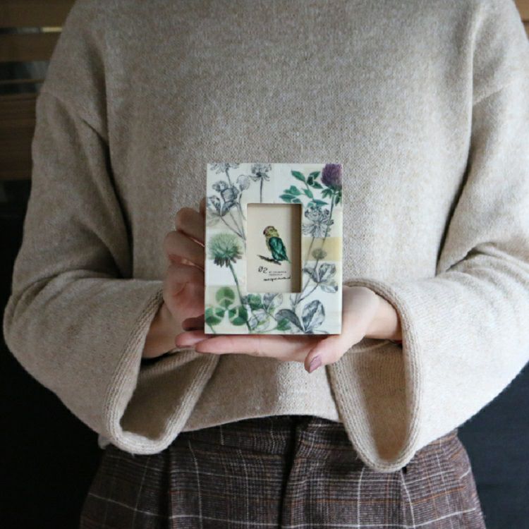 モニークチャートランドのフォトフレームはほかに、ウッド素材を使用したシリーズもあります。ハンドメイドによる温かみとまるで押し花のような生き生きとしたフラワーデザインが魅力。ギフトとして写真と一緒に贈るのもおすすめです。