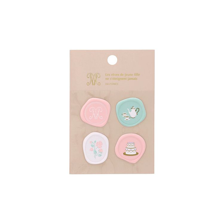 カラーバリエーションは、A(ピンク)、B(ブルー)、C(ミント)の全3柄。 シーリングワックススタンプを押したようなデザインの凹凸のあるシールが4枚入り。バラ、ネコ、ケーキ、靴、カメオなど、思わず見とれてしまうような愛らしいイラストに、心がときめきます。レターの封を閉じるシールとして、ロルバーンの表紙を飾るシールとしてもおすすめです。