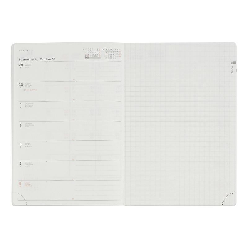 使い勝手のよいA6サイズ。中面は、見開き1ヶ月のマンスリーと、見開き1週間のウィークリーで構成。ウィークリーページは、左ページが週間スケジュール、右ページが方眼メモになったホリゾンタルタイプ。マンスリーページは、6段のカレンダーで、6週になる月の最終週も予定がしっかり書き込めます。ホリゾンタルタイプのウィークリーページは、予定とタスク管理を見開きの左ページに集約できます。1日の左半分を日付入りのフリースペース、右半分を罫線メモスペースに分け、To Doや文章の記入しやすくなっています。見開きの右ページメモは自由度の高い方眼。予定と記録が見渡せて、より書き込みがしやすいレイアウトです。巻末には自由に使える方眼メモも20ページあります。コーナーカット付きで、開きたいページをすぐに開くことができます。リフィルの差し替えも可能です。一回り大きなB6サイズもあります。美しい空の景色が穏やかな時間を届けてくれそうです。