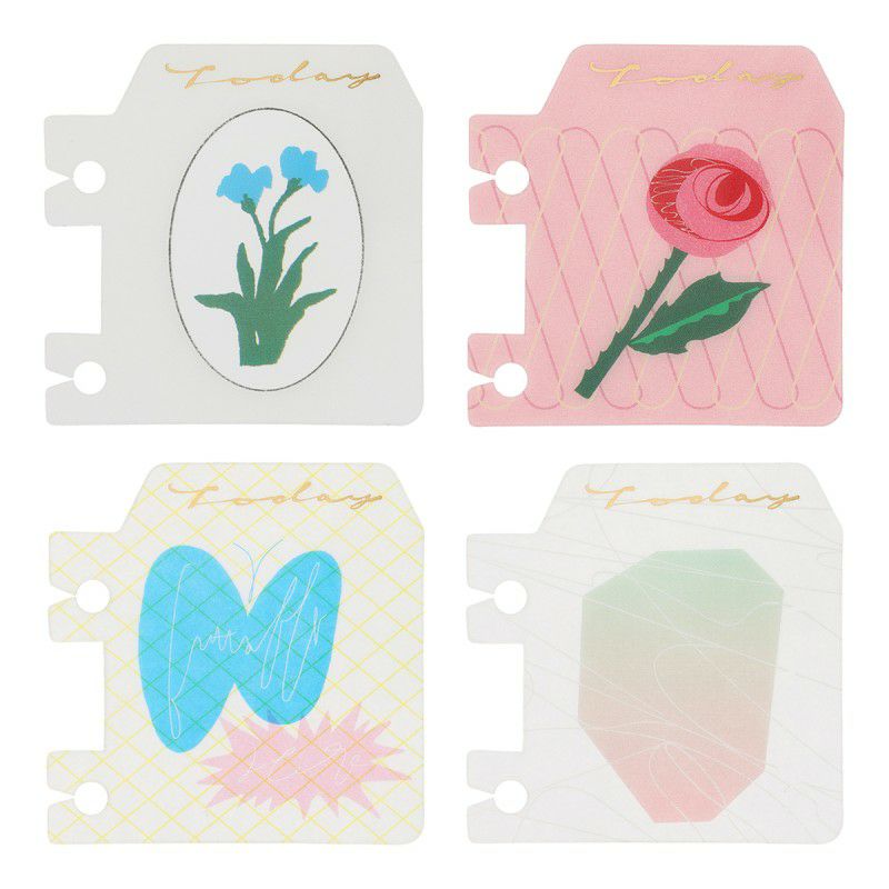 ブルー(A<青い花>)、ピンク(B<バラ>)、イエロー(C<蝶>)、グレー(D<石>)の全4柄。ノートを閉じた状態で目印になる上部には、ゴールド箔でTodayの文字を配しています。一部半透明やクリア素材になっていて、モチーフとの組み合わせが美しいブックマークです。