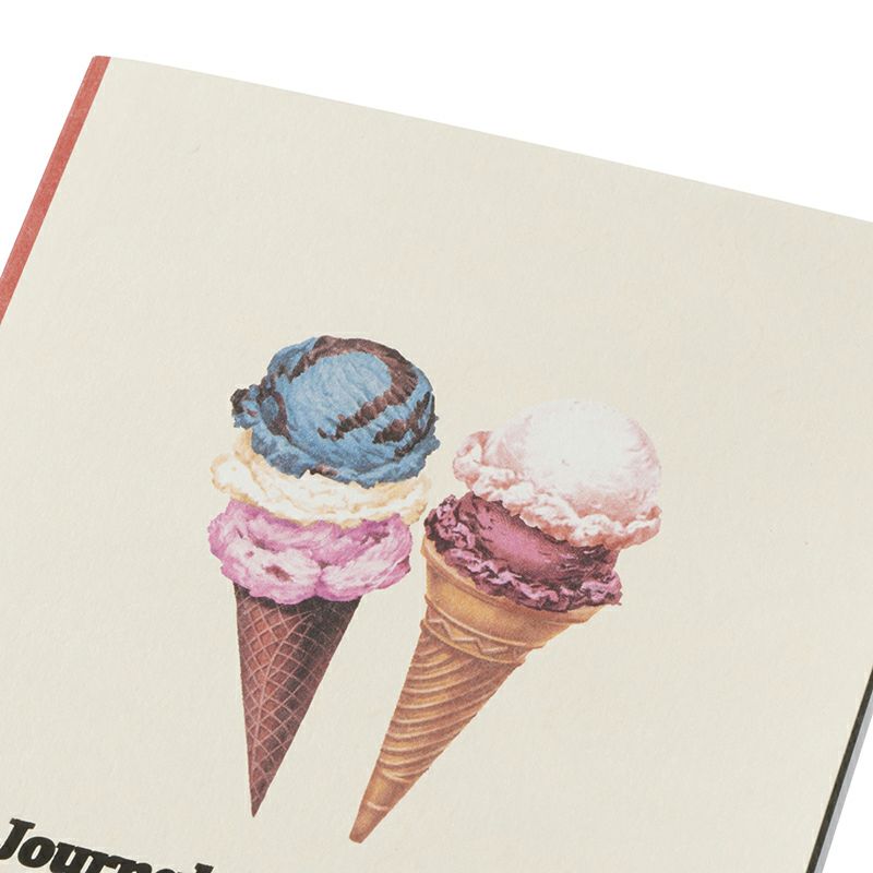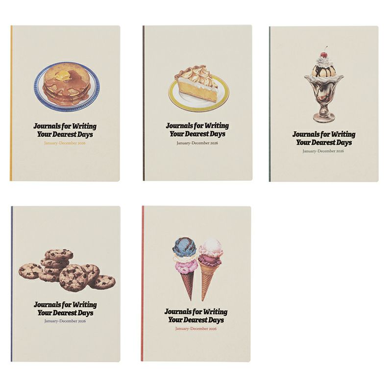 カラーは、ベージュ(A<ホットケーキ>)、ブラウン(B<レモンパイ>)、グリーン(C<サンデー>)、ブルー(D<チョコチップクッキー>)、クリーム(E<アイスクリーム>)の全5柄。 それぞれのモチーフに合わせて、背の部分にも色を配しました。ベージュ(A<ホットケーキ>)にはオレンジ、ブラウン(B<レモンパイ>)にはブラウン、グリーン(C<サンデー>)にはグリーン、ブルー(D<チョコチップクッキー>)にはブルー、クリーム(E<アイスクリーム>)にはレッドのラインを配色。紙製の風合いや重厚感のあるイラスト、クラシカルな書体など、レトロな佇まいが魅力です。