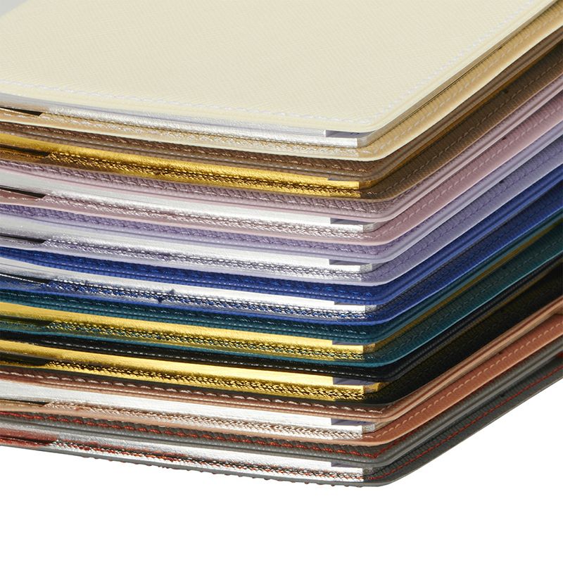 今季は、上品な落ち着きを感じる全9色。光沢が華やかな印象のピンクゴールド、明るい雰囲気のクリーム、ライトピンク、ライトパープル、 シックで落ち着いた印象のブルー、ターコイズ、定番人気のグレージュ、ブラックのほか、DELFONICS Web Shop限定カラーがラインアップ。DELFONICS Web Shop限定カラーのグレーは、カバー内側とステッチにオレンジを使ったバイカラー。小口には、限定カラーのグレー、クリーム、ライトピンク、ライトパープル、ブルー、ピンクゴールドはシルバー箔、その他はゴールド箔が塗られています。ビジネスシーンでも使いやすい色合いで、知的で上品な印象のカラーがそろいました。