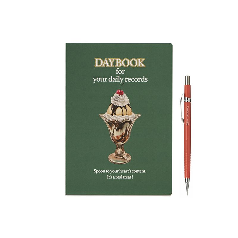 1960年代以前の雑誌広告をイメージし、デザインしたダイアリー。艶やかで甘い、アメリカで愛されているデザートを重みのあるタッチで描きました。クラシックな書体で配した「DAYBOOK」の文字や金の縁取りが世界観を演出しています。