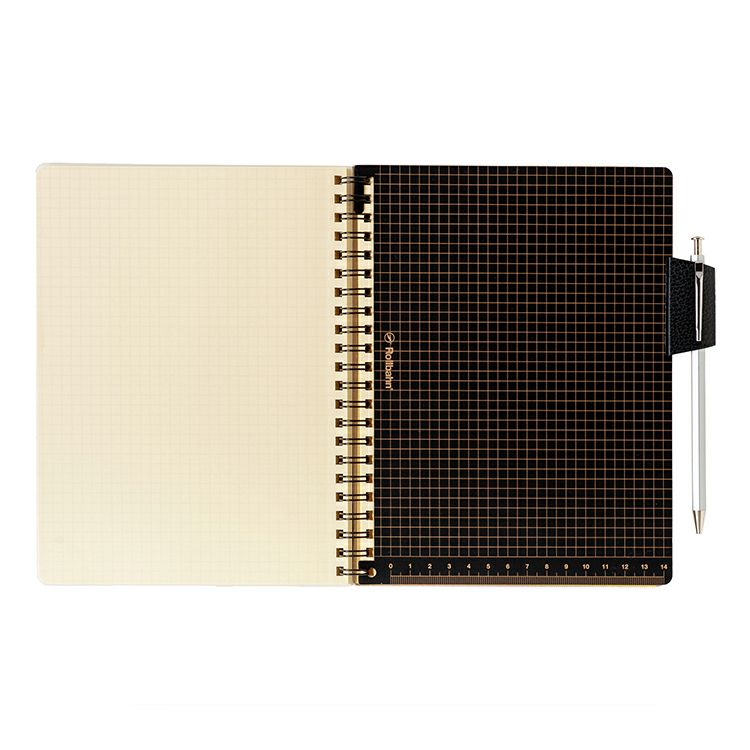 下敷き上部の爪と下部の穴をリングに取り付けて使用。セットすることで、滑らかな筆記を楽しめます。グリットとルーラーのプリントは、実用性だけでなく、遊び心も感じさせます。4色ボールペンなど、太めのペンも収納できる、シボの入ったPVC(塩ビ)のペンホルダー付き。使いたいページをすぐに開くインデックスにもなります。