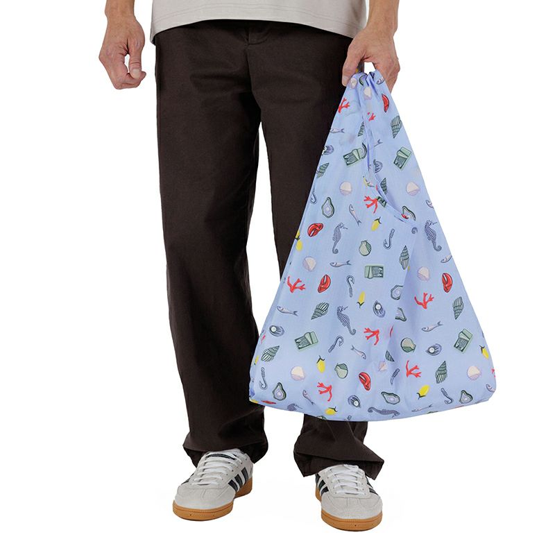 2022年シーズンのモデルから、100%リサイクルのナイロン生地にリニューアル。従来の40%リサイクルナイロンに比べ、よりサステナブルなアイテムになりました。2リットルのペットボトルもゆったり収納できるサイズで、スーパーの買い出しはもちろん、旅行やトレーニングなどのさまざまなシーンで活躍します。付属の収納袋に折り畳んで収納し、手のひらに乗るコンパクトサイズにして持ち運びが可能です。小ぶりサイズのBABY BAGGUもあります。お出かけの際に1つは持っておきたいエコバッグ。プチギフトにもおすすめです。