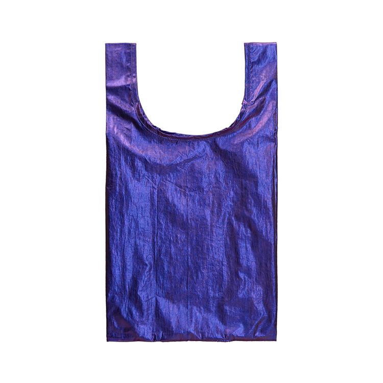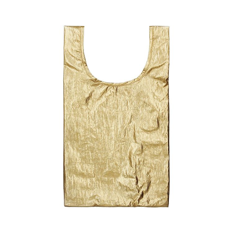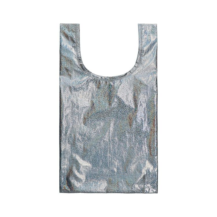 カラーバリエーションは、メタリックオーロラ、メタリックホログラム、メタリックシルバー、メタリックゴールドの全4色。メタリックオーロラとメタリックホログラムは2023年の新色です。スーパーのレジ袋を原型にしたシンプルな形状で、マチをたっぷりとっているのが特徴。光沢のある滑らかなナイロン素材で、軽量で耐久性があり、長く使えます。2022年シーズンのモデルから、100%リサイクルのナイロン生地にリニューアル。従来の40%リサイクルナイロンに比べ、よりサステナブルなアイテムになりました。