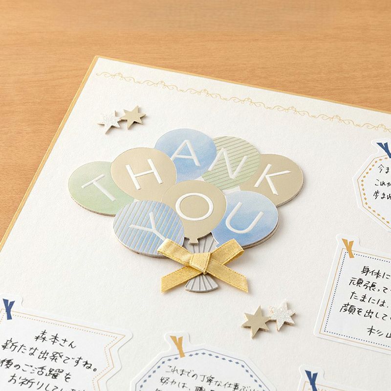 メッセージカードやアルバム、色紙などに貼るだけで、手軽に華やかなデコレーションが完成するアイテムです。