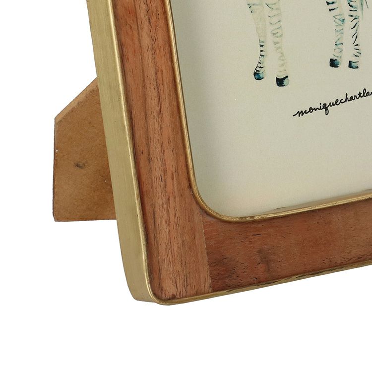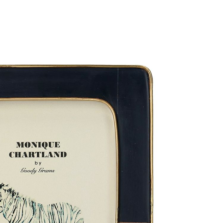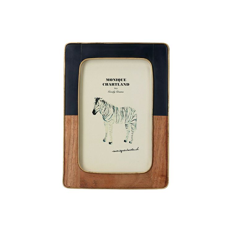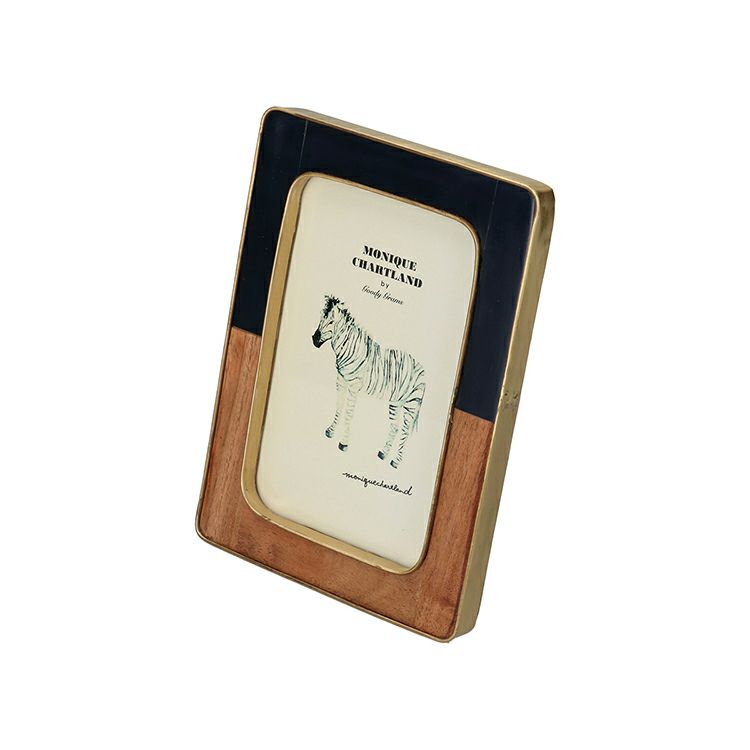 フレーム上部に黒いレジン、下部にチークウッド、枠組みに真鍮を使用。異なる素材のコントラストが魅力的なデザイン。背面には置き型と壁掛けの使い方が可能なスタンドと吊り金具付き。フォトフレームはすべて手作業で作られたもので、装飾も手作業で施され、ひとつひとつ異なった風合いが感じられます。フレームにはイラストが描かれた中紙がセットされているため、インテリアとしてそのまま飾ることができます。