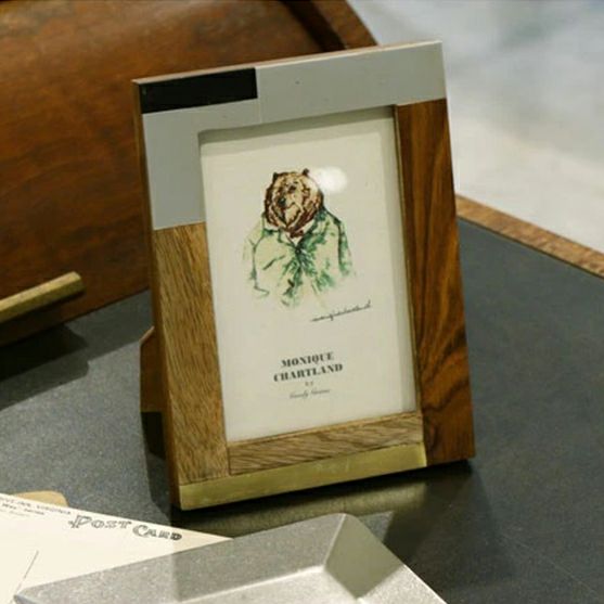 ボディにはレジン、ウッド、真鍮などの素材を使用。木材によるナチュラルなテイストの中に、レジンや真鍮などの異素材が加わり、都会的で洗練された雰囲気の個性的なデザイン。背面には置き型と壁掛けが可能なスタンドと吊り金具付き。フォトフレームは装飾を含めすべて手作業で作られ、ひとつひとつ異なった風合いです。フレームにはイラストが描かれた中紙がセットされているため、インテリアとしてそのまま飾ることができます。