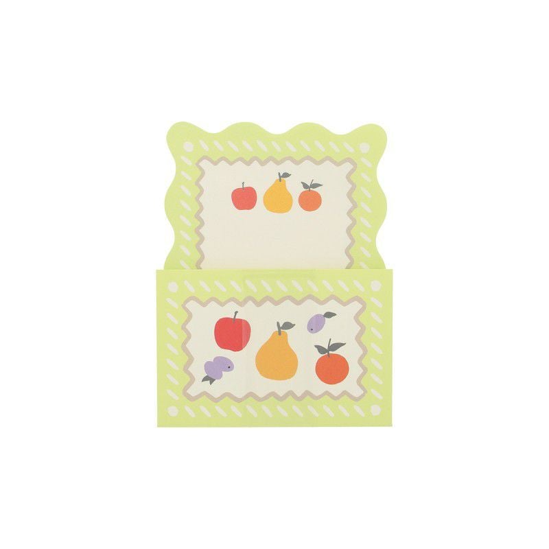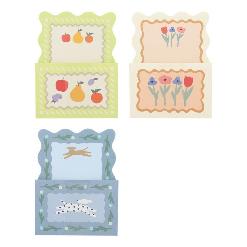 絵具で描いたようなフルーツ、フラワー、イヌのモチーフや洋皿の装飾を思わせる縁取りのデザインを、温かみのある色で配した「パルテ」シリーズのミニレターセット。印象的なモチーフや色使いが明るく穏やかな気分を届けてくれます。