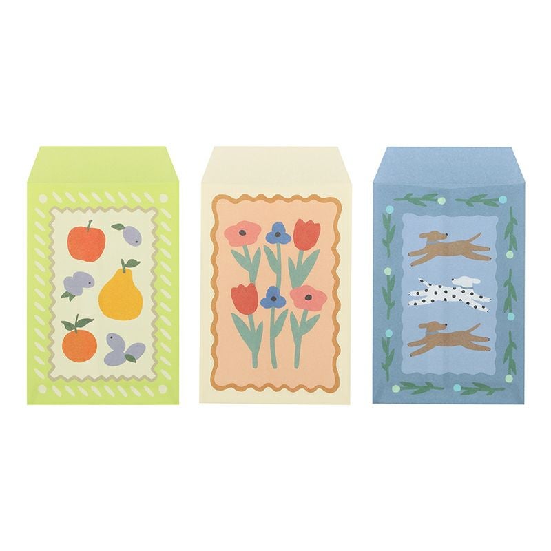 5枚入りで、はがきサイズ程度を収納可能。ちょっとしたプチギフトやメッセージカードを入れる封筒としても使えます。同シリーズは、ほかに、ロルバーン ポケット付メモ、マグネットマーカー、シール、パスケース、キーホルダーがあります。お好みの絵柄で組み合わせたギフトもおすすめです。