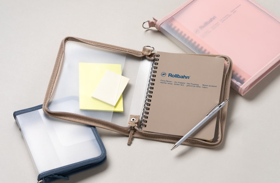 ベーシックな無地のグレージュ、イエロー、ダークブルーの全3色。表紙には「Rollbahn 365」のロゴを配しました。どんなシーンにもなじむ、ユニセックスなカラーバリエーションです。