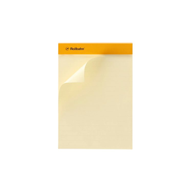 表紙を上にめくって使用する縦型タイプ。中面はクリーム色の7mm罫線が50ページ。ロルバーンシリーズでは唯一の罫線フォーマットです。切り離しに便利なミシン目もあります。定番カラーのイエロー表紙は、折り目に沿って折り返すと左上のロゴがポイントに。耐久性を高めるための透明フィルム加工も施されています。