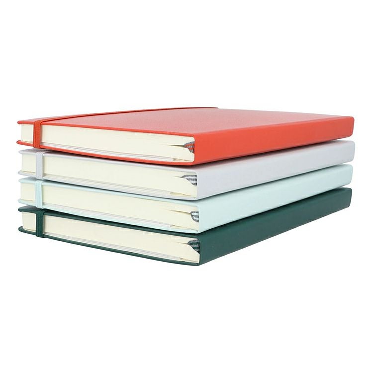 カラーは、爽やかな印象のミントグリーン、鮮やかな発色のフォックスレッド、木々の力強さを感じるフォレストグリーン、繊細で落ち着きのあるライトグレーの全4色。A5サイズ相当のミディアムサイズ。鮮やかな発色のハードカバーで、色を合わせたゴムバンドと2本のスピンが付いています。用紙はインクが裏抜けしにくい上質紙で、記録や保存に適したアシッドフリーペーパーを使用。表紙を開くと、空欄の目次ページがあります。自由に使える6mm幅の横罫に振られたページ番号と目次を連動させることで、探したい内容やページを簡単に検索できます。この機能が、話題のバレットジャーナルと相性が良いと言われています。