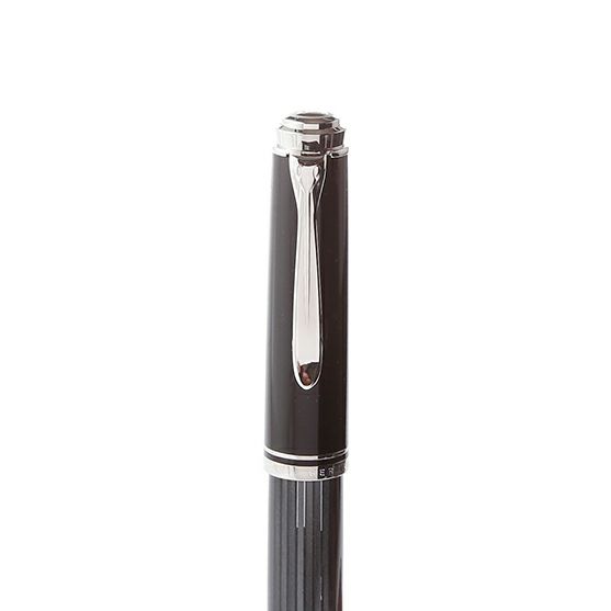 洗練されたブラックストライプにシルバーが映えるコンパクトな吸入式万年筆