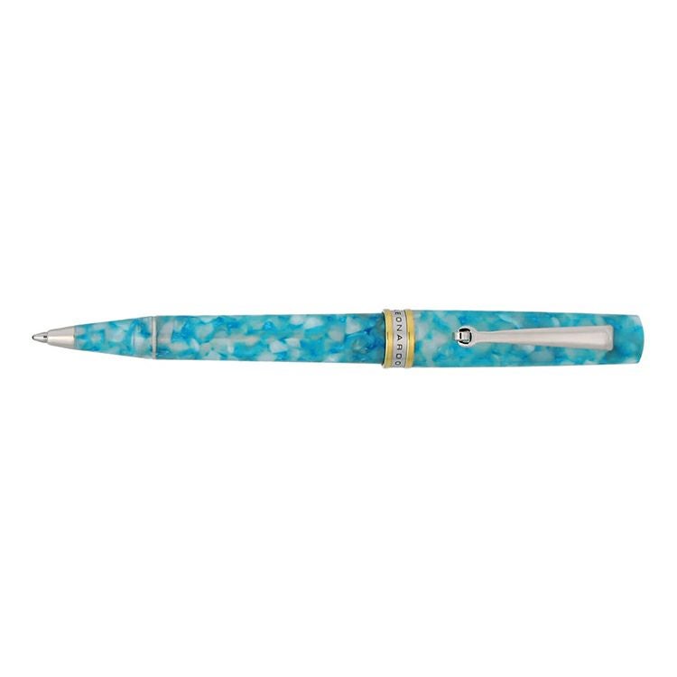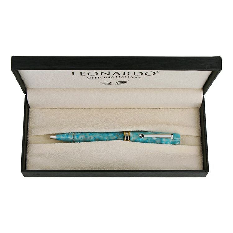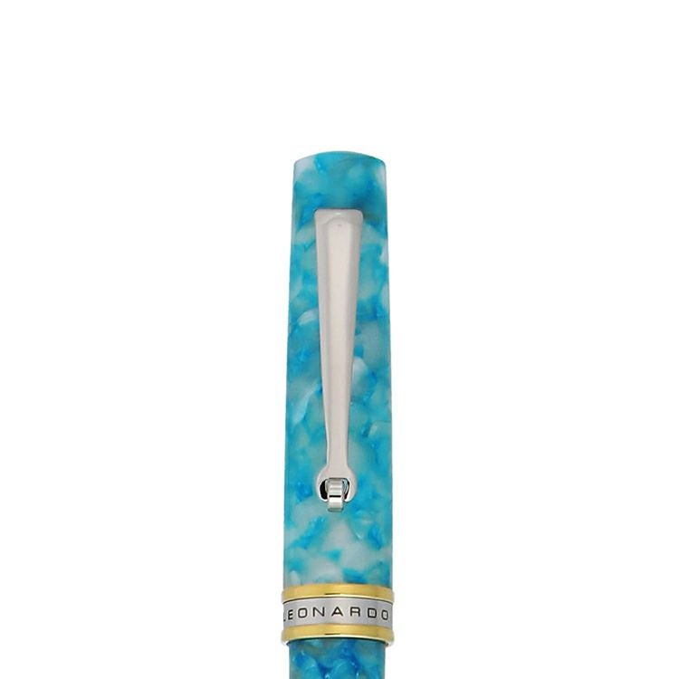 「ノスタルジア」はイタリア語で「郷愁」を意味し、故郷、かつて旅した異国の地などの場所や時代に戻りたいという思いを体現したシリーズです。美しい濃淡が交じり合う特徴的なレジンは、切り口によってすべて表情が異なり、同じ柄のものは世界に一つとありません。4つのカラーは、イタリアの文化や風土をイメージして作られています。「メログラーノレッド」は、数千年前から主に地中海沿岸で栽培されている、イタリア古来の果物であるメログラーノ(ざくろ)の赤い実をイメージ。「グロッタブルー」は、カプリ島の代表的な観光地であるグロッタ・アズーラ(青の洞窟)の神秘的な青い水面をイメージしています。「ポルトフィーノターコイズ」は、ヨットやボートが停泊するリゾート地のマリーナを見下ろした時の海を思わせます。リグーリア湾に面する小さな村ポルトフィーノのターコイズブルーの海が表現されています。「エテルニタグレー」は、ローマの街並みや遺跡を連想させるグレー。チッタ・エテルニタ(永遠の都)と呼ばれていたローマの火山岩で造られた建物や道路をイメージしています。本体は、程よい重量感で手に馴染むサイズ。軸をツイストしてペン先を繰り出す回転式で、ペン先はブラックのM(中字)です。全体のアクセントになっているバイカラーのキャップリングには、「LEONARDO」のロゴと「ITALY」の文字が刻印されています。クリップの可動式リングは、ポケットに挿し込む際の傷防止になっています。