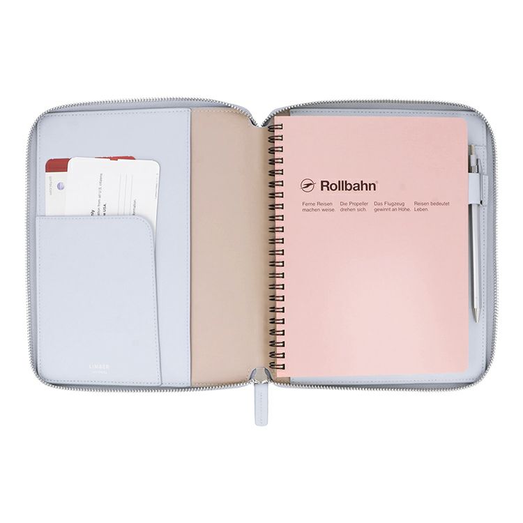 ノートカバーとして、ノートや文房具を収納できるラウンドケース。一般的なA5サイズのノートやダイアリーリフィルのほか、「ロルバーン ポケット付メモ A5」、「ロルバーンダイアリー A5」、「ロルバーン ノートパッド A5」、「ダイアリーリフィル A5」が収納できる大きさです。3辺を囲むラウンドファスナーで開閉でき、開いた左側にはカードやシールなどが挟めるコーナーポケットが1つ。右側には「ロルバーン ノートパッド A5」を縦差しできるスリットがあります。ペンホルダー付きで、お気に入りの文房具と一緒にノートを持ち運びできます。同カラーは、ほかに一回り小さなB6サイズと、IDカードホルダー、コンパクトなボックスケースもあります。