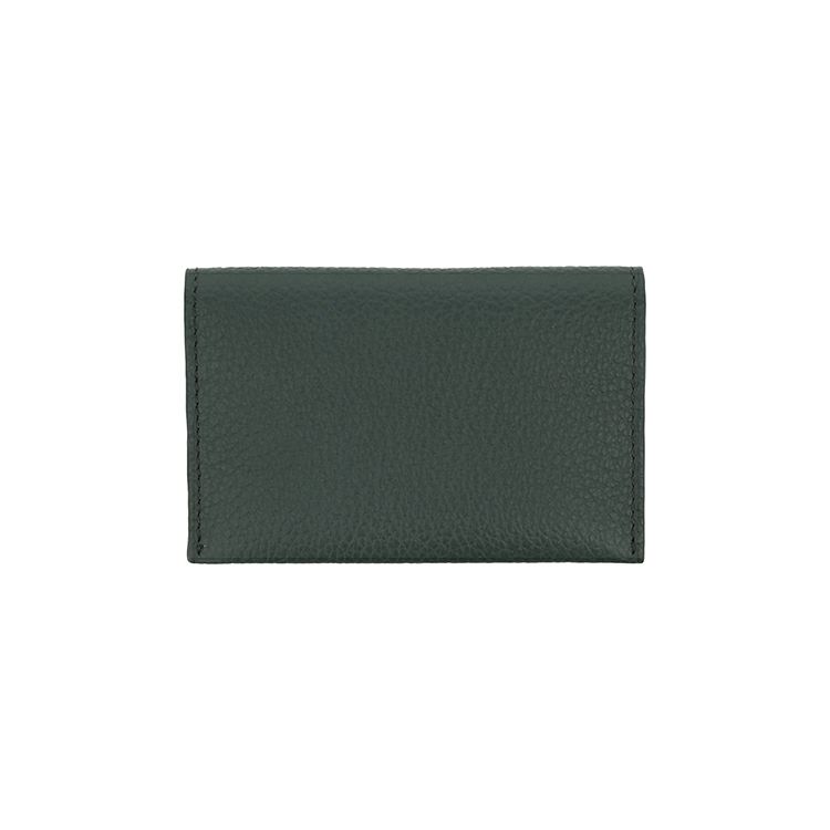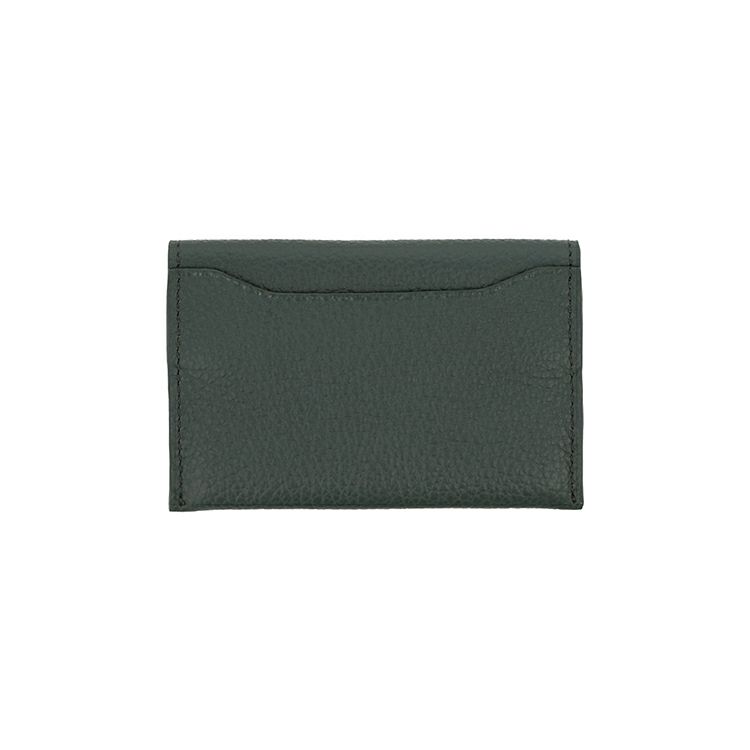 カラーは、フォレストグリーン、ダルグレーの全2色。重厚感のあるカラーリングに仕上げました。開くと二つのポケットがあり、メインポケットは、立体的な縫製で名刺が約15~20枚程度入ります。マチはありませんが、厚みが出過ぎず、ポケットに入れるには最適な厚みです。反対にある薄いポケットは、相手の名刺をしまうのに便利。開いた際にも入れた名刺が落ちにくいよう、フィット感のある仕様になっています。背面にもポケットがあり、ICカードなど普段使うものを入れられます。やわらかく手になじみやすい革質と、大きめのシボ模様が上質な印象です。