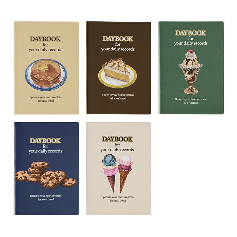 2024年10月始まりでも人気を博した、メープルの甘さと焼きたての香りがふんわりと立ちのぼるようなベージュ(A<ホットケーキ>)、メレンゲの焦げやとろけるソースが魅力的なブラウン(B<レモンパイ>)、カラフルなアイスを描いたクリーム(E<アイスクリーム>)に、今季新しく登場した、グラスの中で溶け合うバニラアイスとチョコソースが印象的なグリーン(C<サンデー>)、ホームメイドのチョコチップクッキーをイメージしたブルー(D<チョコチップクッキー>)の新柄を加えた全5柄。表紙のタイポグラフィは、ゴールドで縁取るなど、クラシックな印象で、アメリカンスイーツの世界観を楽しめるデザインに仕上げました。イラストが映える背景色にもこだわっています。