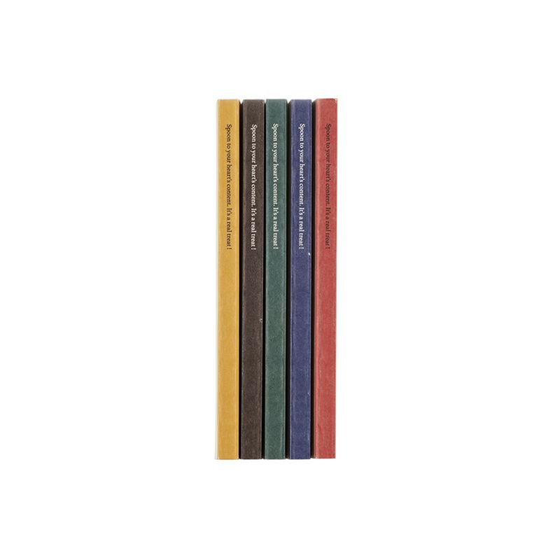 カラーは、ベージュ(A<ホットケーキ>)、ブラウン(B<レモンパイ>)、グリーン(C<サンデー>)、ブルー(D<チョコチップクッキー>)、クリーム(E<アイスクリーム>)の全5柄。 それぞれのモチーフに合わせて、背の部分にも色を配しました。ベージュ(A<ホットケーキ>)にはオレンジ、ブラウン(B<レモンパイ>)にはブラウン、グリーン(C<サンデー>)にはグリーン、ブルー(D<チョコチップクッキー>)にはブルー、クリーム(E<アイスクリーム>)にはレッドのラインを配色。紙製の風合いや重厚感のあるイラスト、クラシカルな書体など、レトロな佇まいが魅力です。