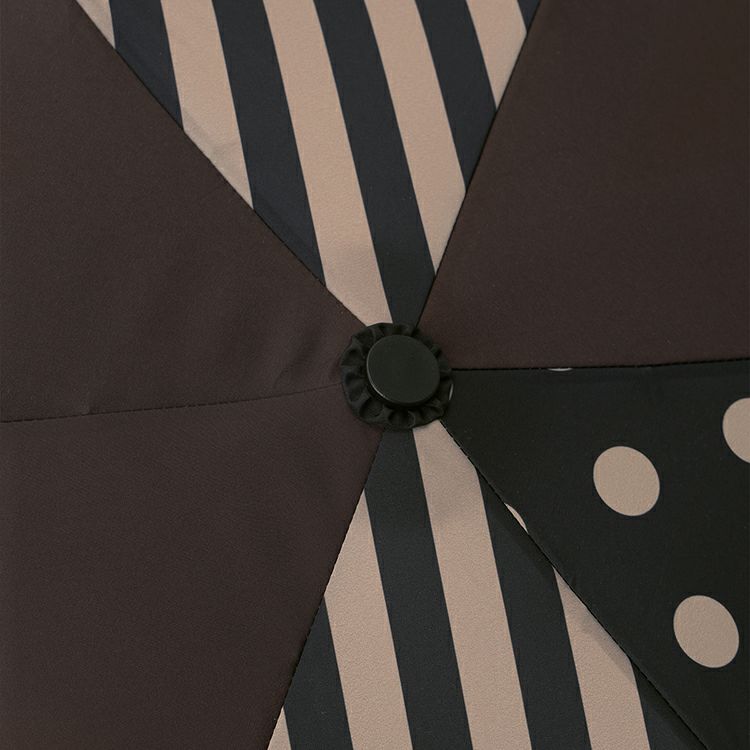 ブラウンを基調とした、無地、ストライプ、ドットの生地を組み合わせたデザイン。同生地の収納袋が付属しています。他に、カラーの異なる生地や、チェック生地を組み合わせたアイテムもあります。廃棄される予定の生地、骨やハンドルといった傘パーツを少しでも生かすため、1点ものの傘としてアップサイクルする活動からスタートしたブランド。「+RING coco」は、定番生地をランダムに組み合わせた張り分けパターンデザインシリーズです。