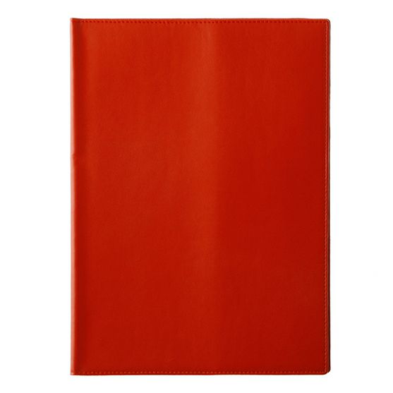 カラーは、ブラック、レッド、オレンジの全3色。細かく表情が入った加工が、本革のような高級感を演出。カバーの内側にはペンホルダーとブックマーク、名刺やカードを入れられるポケット付き。持ち歩きに便利な工夫が施されています。