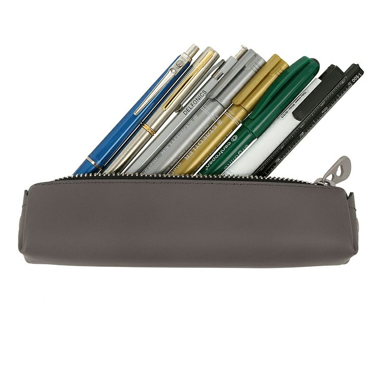 1枚革仕立ての作りで、丸みのある綺麗なフォルム。見た目はコンパクトなサイズながら、細軸のペンであれば7~8本程度、ペン4~5本であれば、消しゴムと定規も収納できます。専用の箱入りで、ギフトにもおすすめです。