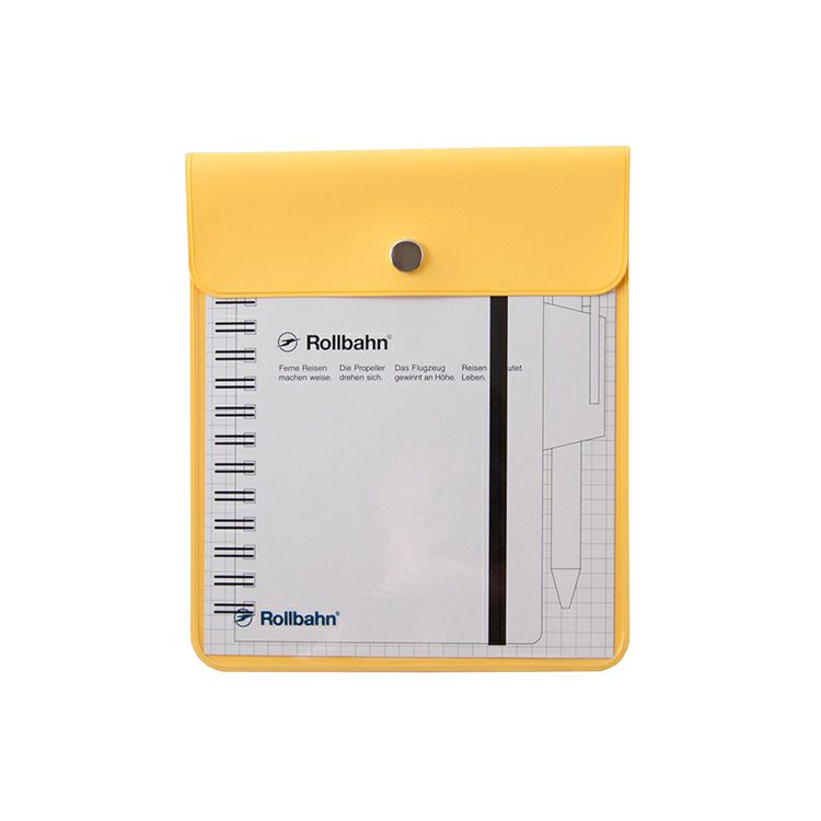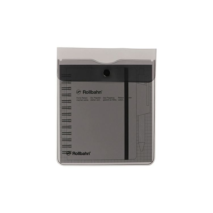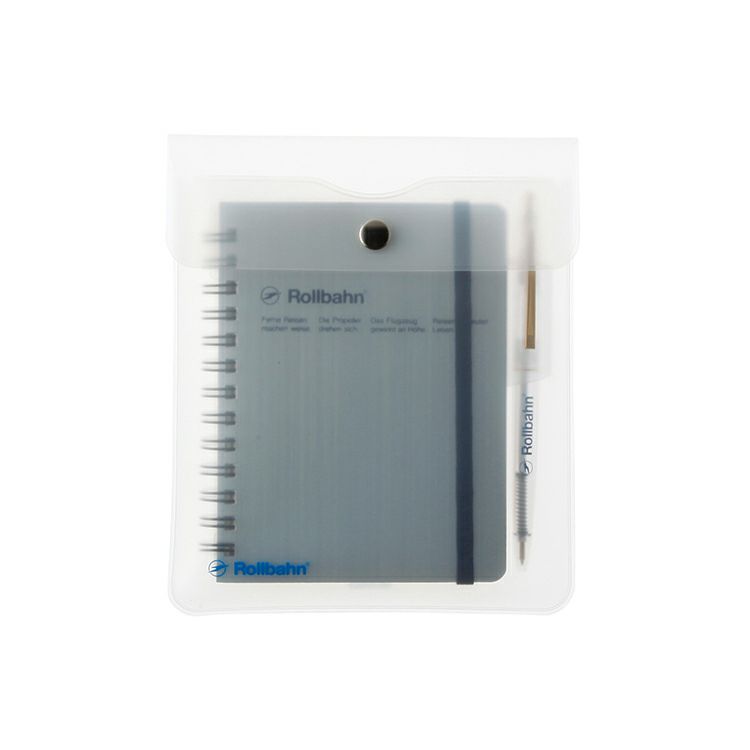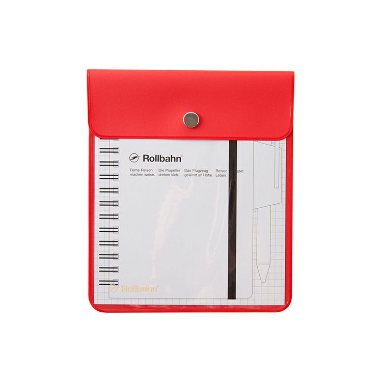 カラーは全6種。クリアグレーが新色として登場しました。イエロー、レッド、グレーは中が透けて見えるタイプ、クリア、クリアグレーは半透明タイプ、ダークブルーは不透明タイプ。滑らかな手触りのPVC(塩ビ)素材。コンパクトさが魅力の「ロルバーンポケット付メモM」に専用の下敷きをセットし、ペンを差し込んだ状態でぴったりと収納できます。前面にさりげなく入ったロゴがアクセント。