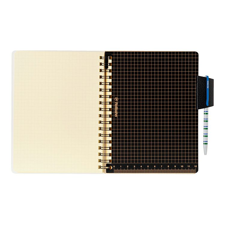 下敷き上部の爪と下部の穴をリングに取り付けて使用。セットすることで、滑らかな筆記を楽しめます。グリットとルーラーのプリントは、実用性だけでなく、遊び心も感じさせます。4色ボールペンなど、太めのペンも収納できる、シボの入ったPVC(塩ビ)のペンホルダー付き。使いたいページをすぐに開くインデックスにもなります。
