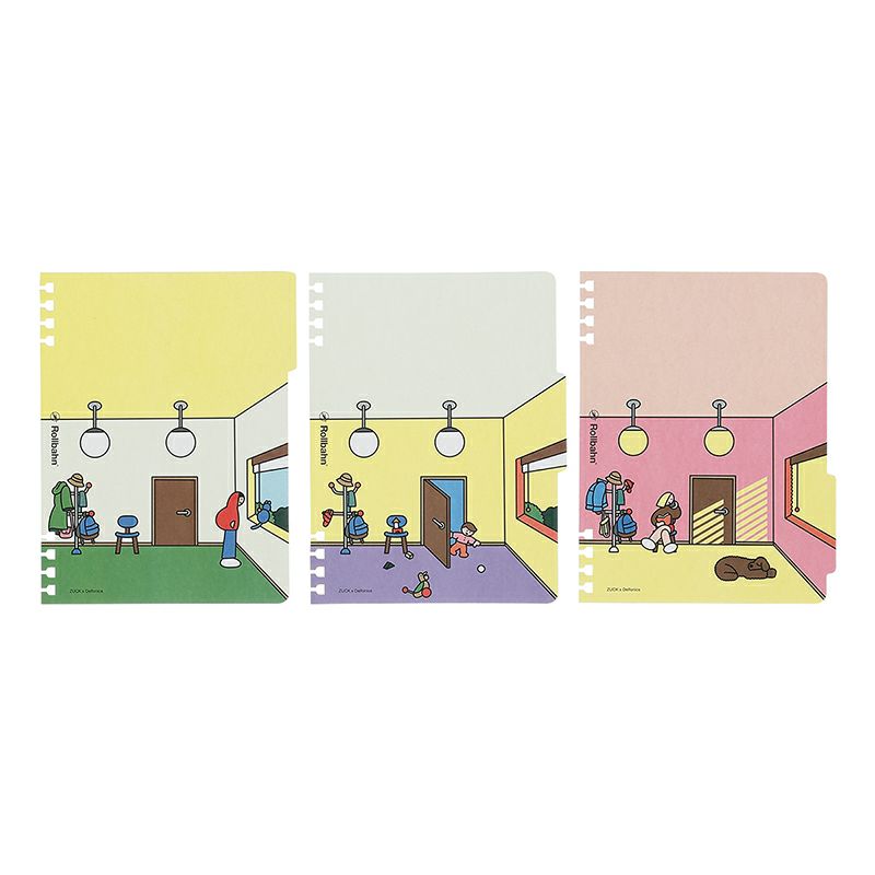 「ロルバーンフレキシブルカバー360°」と、色使いも楽しい3種類のリフィル、紙製インデックスシート、紙製エンベロップポケットが入ったセット。日記はもちろん、鑑賞、読書、お出かけログ、アイディアメモ、家計簿やヘルスケアの記録にもおすすめ。自分の用途に合わせてカスタマイズしながら、1冊を通して日々の記録を楽しめます。表紙、裏表紙は紙素材です。カバー表紙とインデックスシートには、このアイテムのために作られたZUCKさんによるイラストを配しています。家の中で過ごすにぎやかな様子や徐々に移ろう時間を表現し、生活の楽しみを感じさせてくれるようなデザインです。