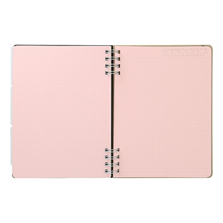 付属のリフィルは、日記やレビューに最適な4分割の「リフィル ブロック」、項目ごとに整理ができて小さな文字も書きやすい2mm方眼の「リフィル 方眼2mm」、上部の月・曜日・日付フォーマットで簡単に日付をナンバリングできて自由度の高い「リフィル 方眼デイリー」がそれぞれ5枚ずつセットされています。リフィルのほかに、目印として役立つ嶋田里英さんのイラストを配したデザインの紙製インデックスシートが3種各1枚ずつと、蓋つきでシールなどの小物を入れて一緒に持ち運べる窓付き紙製エンベロップポケットが3色各1枚ずつ付いています。「リフィル ブロック」は1ページが4分割されているため、1日1マスの日記としての記録におすすめ。日付を書く欄と天気マークがあり、日々の記録が簡単にできます。「リフィル 方眼2mm」は小さな文字も書きやすい2mm方眼。左側に日付や簡単なタイトル、右側に記録といった書き込みが可能。左右を区切るラインにはガイドがあり、点にあわせて横に線をひくことで1ページを7等分できます。一言日記、ミーティングの記録、映画や本の鑑賞記録にも活用できるフォーマットです。「リフィル 方眼デイリー」は自由度の高い5mm方眼。1日1ページ、または1ページに1つの記録をするなど、上部の月・曜日・日付が並んでいるフォーマットに丸をつけることで日付をマークできます。日付の左側のスペースにはタイトルを書くことも可能です。カバーは、表紙と裏表紙が切り離されたされた形状のため、背の部分がなく、リングノートと同じように、表紙を360°折り返してコンパクトに使えます。自宅のデスクなど限られたスペースで使いやすい形状です。中身のリフィルは、スリット入りのリング穴で、本体の上下にある各4つのリングから取り外し、付け替えが可能。リングから取り外す場合には、一度に3枚程度をまとめてリフィルの上下どちらかの端を垂直に引き上げてリングから外します。