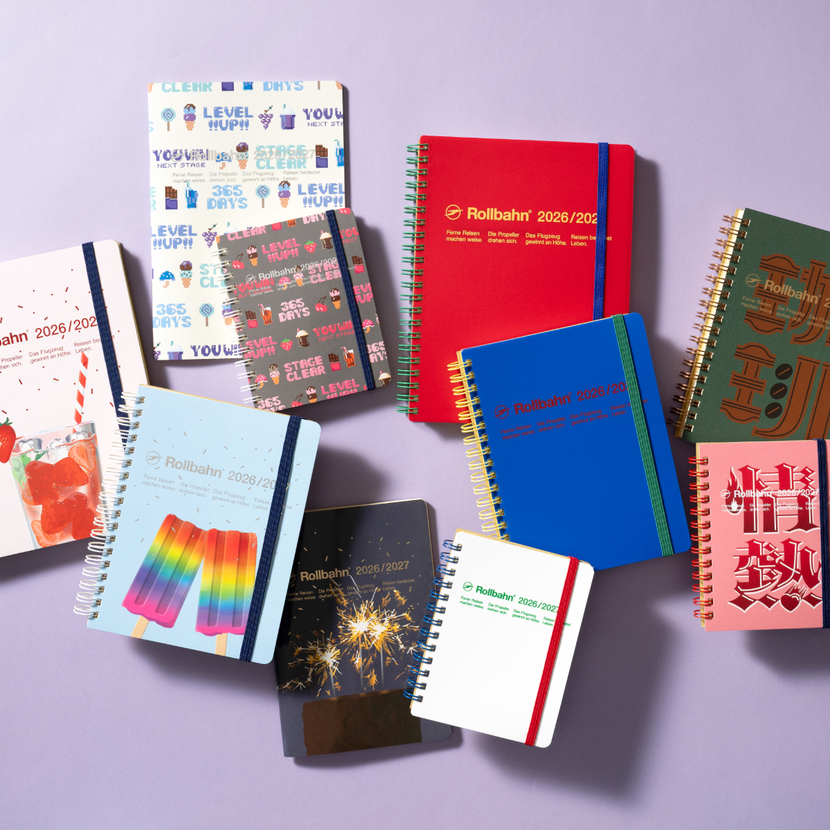 思わず目を引く色づかいやモチーフで、ページを開くたびに気分が上がるデザイン。大胆なタイポグラフィが映える「Moji」は、言葉そのものを楽しめる1冊。デザートとコンフェッティを描いた「ヤミー」は、レインボーアイスやチョコレートケーキが新登場し、今日を少し特別に彩ります。ドット絵で世界観を表現した「レベルアップ」は日々を進める感覚を軽快に演出。発色のよいPP素材の「ビボ」は差し色が映えるポップな佇まいです。