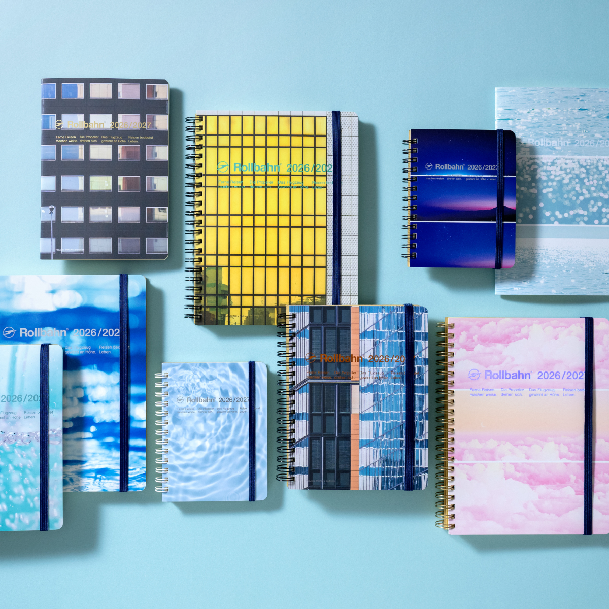 一瞬の光や移ろう景色を表紙に写し、写真ならではの空気感を表現したデザインがそろいます。フォトグラファーYasuyuki TAKAKIさんとのコラボレーションは、規則正しく並ぶ窓に都市の空や景観が映り込む魅力的な1冊。建物の構造と風景が重なり、日常を静かに切り取ります。「アクア」は水面のきらめきや波紋をテーマにした全3柄がそろいます。「フィルム」は移ろう景色や感情を3分割の構図で表現し、記憶に奥行きを添える1冊です。